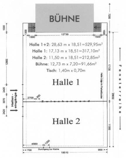 Saal 1 + 2 mit Bühne: 529,95 m²